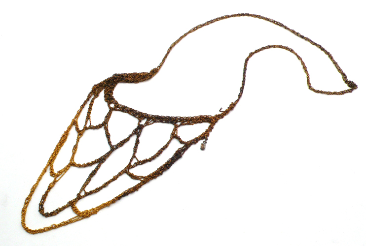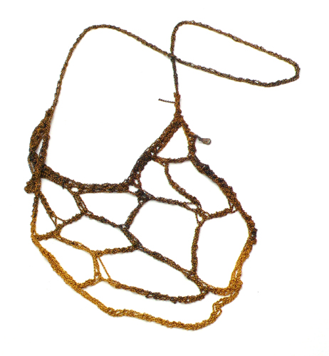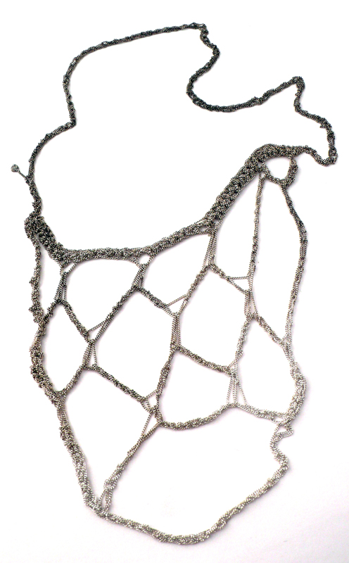 Arielle de Pinto Web Necklace Beautifully handcrafted in Canada, this necklace is literally "knit" into a uniquely organic texture, resembling a spider web. Each necklace has a 25 inch neckline. The silver necklace is made with Italian 925 sterling silver with midnight-colored oxidation in a gradient effect, while the gold necklace is made from Gold Vermeil with a burnt gold gradient effect. SOLD OUT! PLEASE E-MAIL US TO INQUIRE ABOUT A SPECIAL ORDER. |