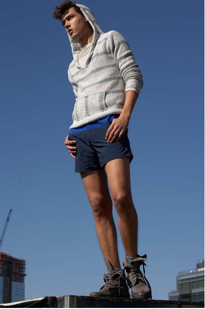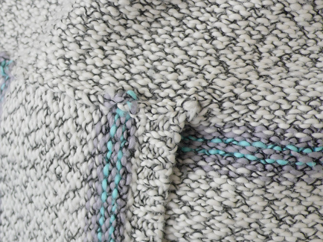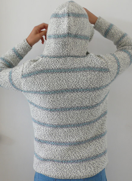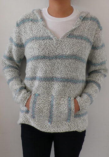 Supersoft knit baja poncho sweater in heathered white with grey/aqua stripes. Features a v-neck, peaked hood, kangaroo pocket and ribbing at neck and cuffs.